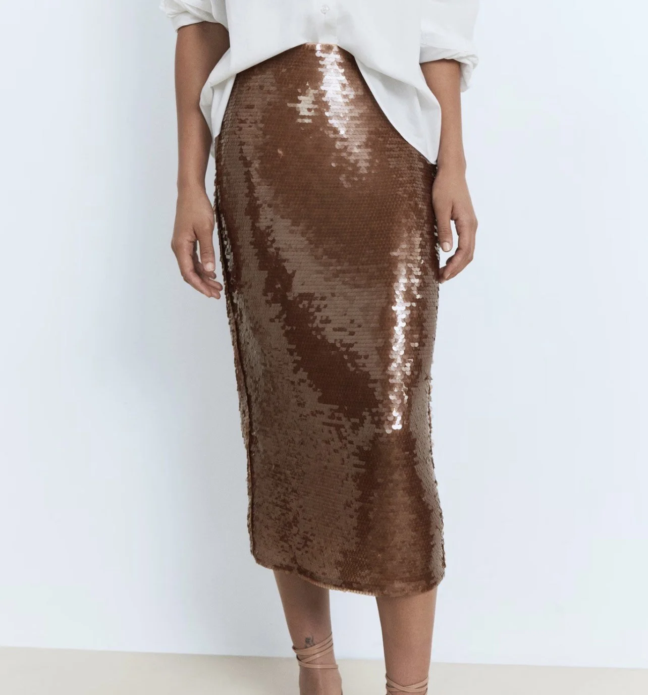 Sequins, but make them wearable. This copper-toned sequin skirt moves beautifully, catching the light without overwhelming. Dress it down with a crisp white shirt (as Mango shows) or lean into glamour with a silk camisole. Perfect for weddings, rooftop parties, or just when you want to turn heads.