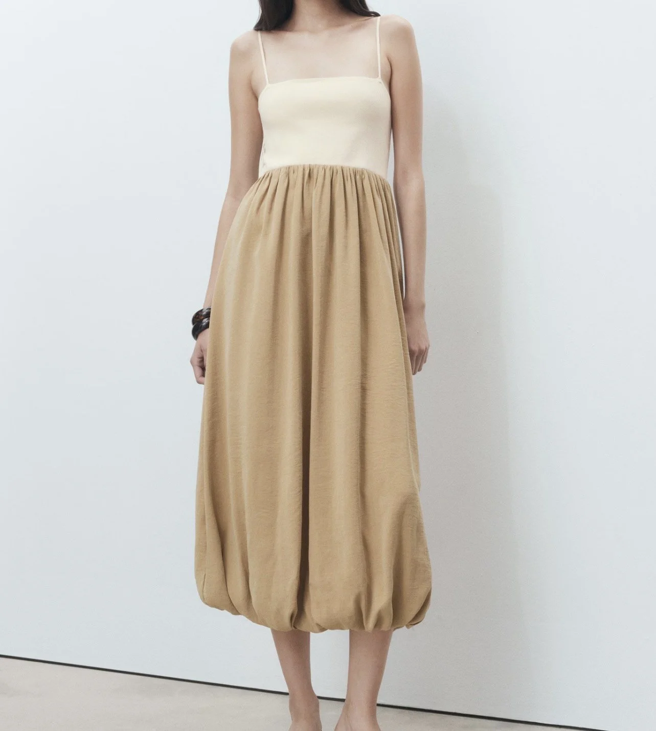 A contemporary update on the slip dress, this two-tone midi plays with proportion. The fitted bodice contrasts with the voluminous balloon hem, creating a silhouette that feels fresh and fashion-forward. Pair with flat sandals for an understated day look, or elevate with sculptural heels for evening wear.