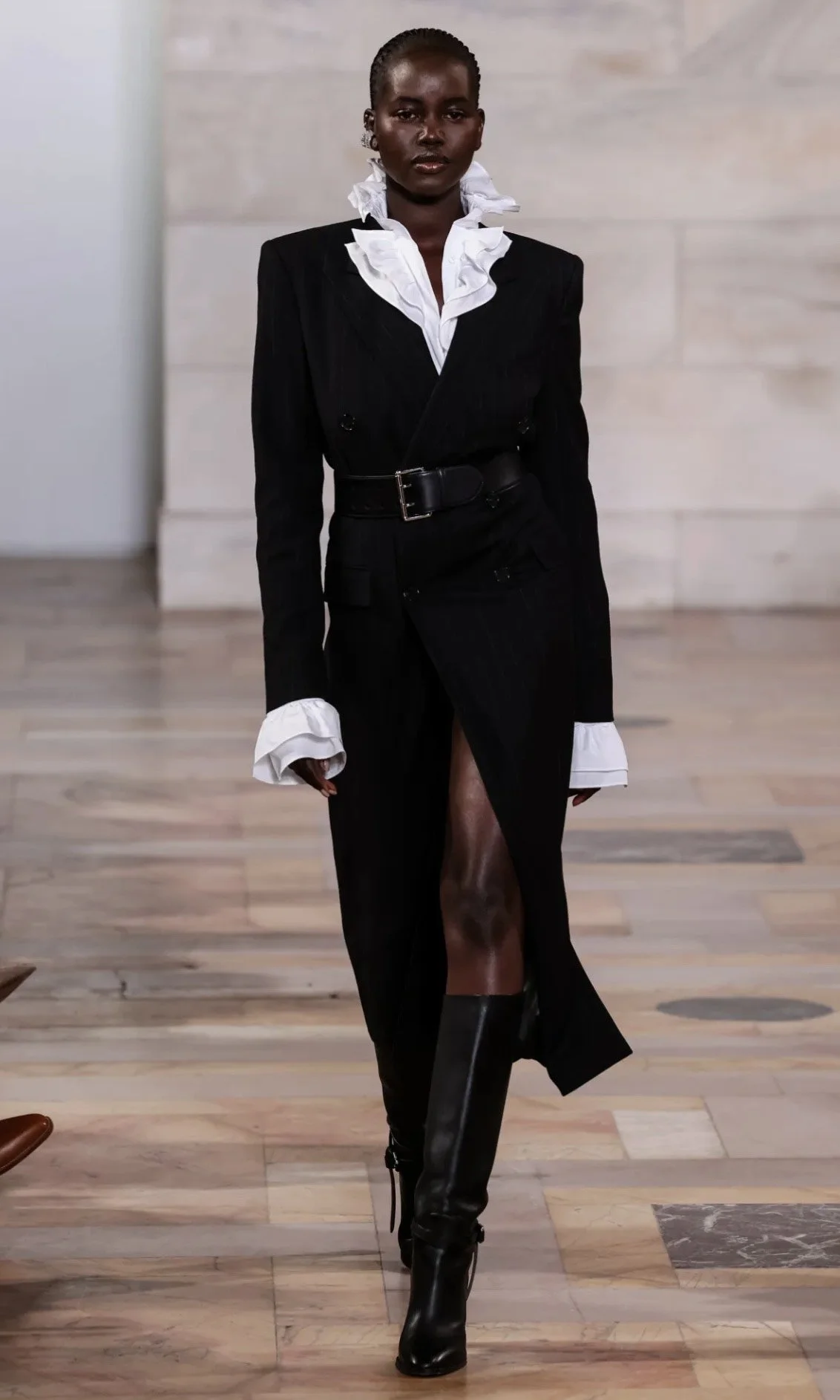 The structured double-breasted blazer is nipped at the waist with a wide leather belt, while cascading ruffles at the collar and cuffs add drama. Styled with knee-high boots and a daring slit, this look proves tailoring can be sensual.