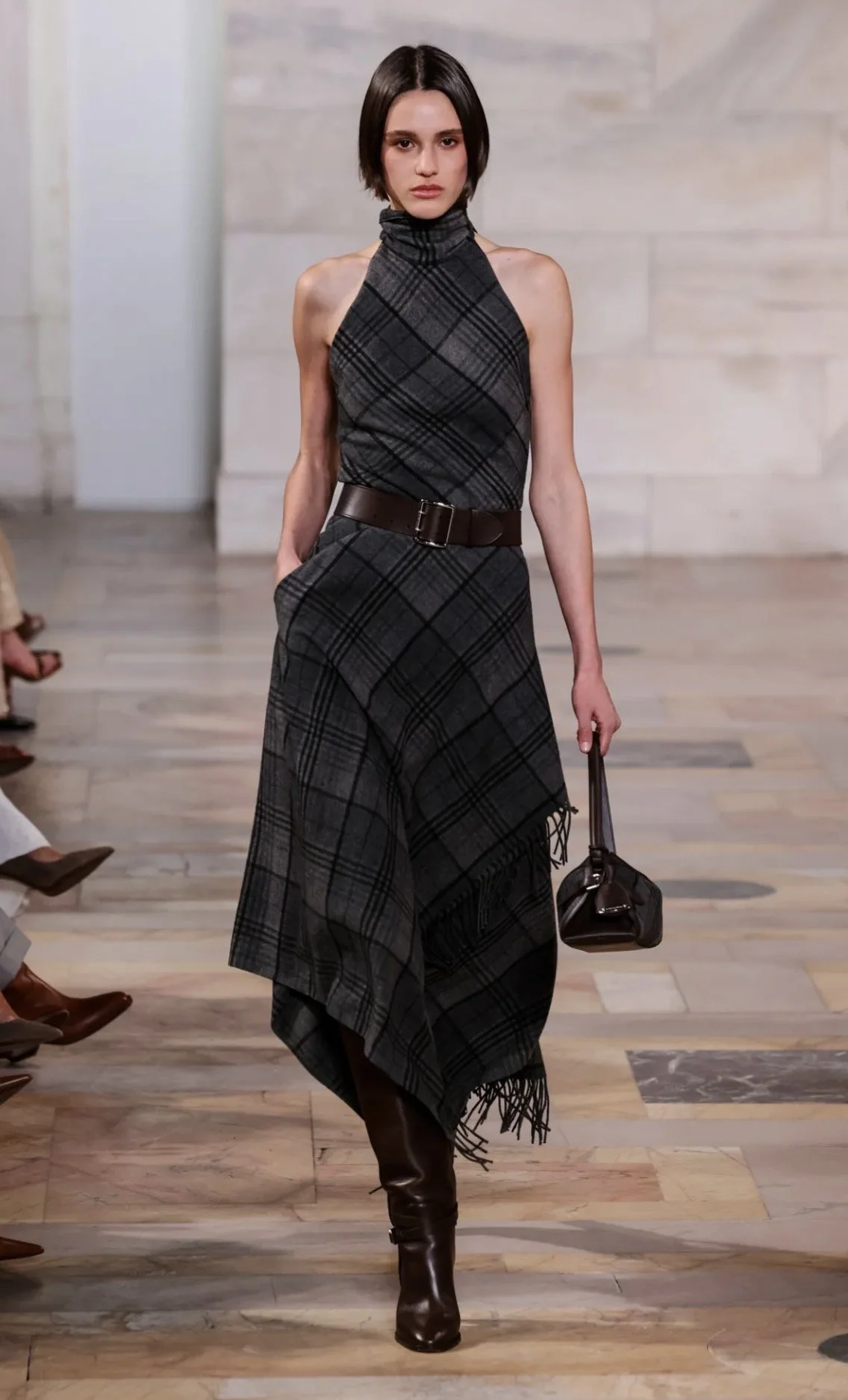 Heritage fabrics are Ralph’s DNA, but here plaid is reborn as a halter dress with asymmetric hems and frayed edges. The wide belt grounds the fluidity, while tall boots give the look strength.