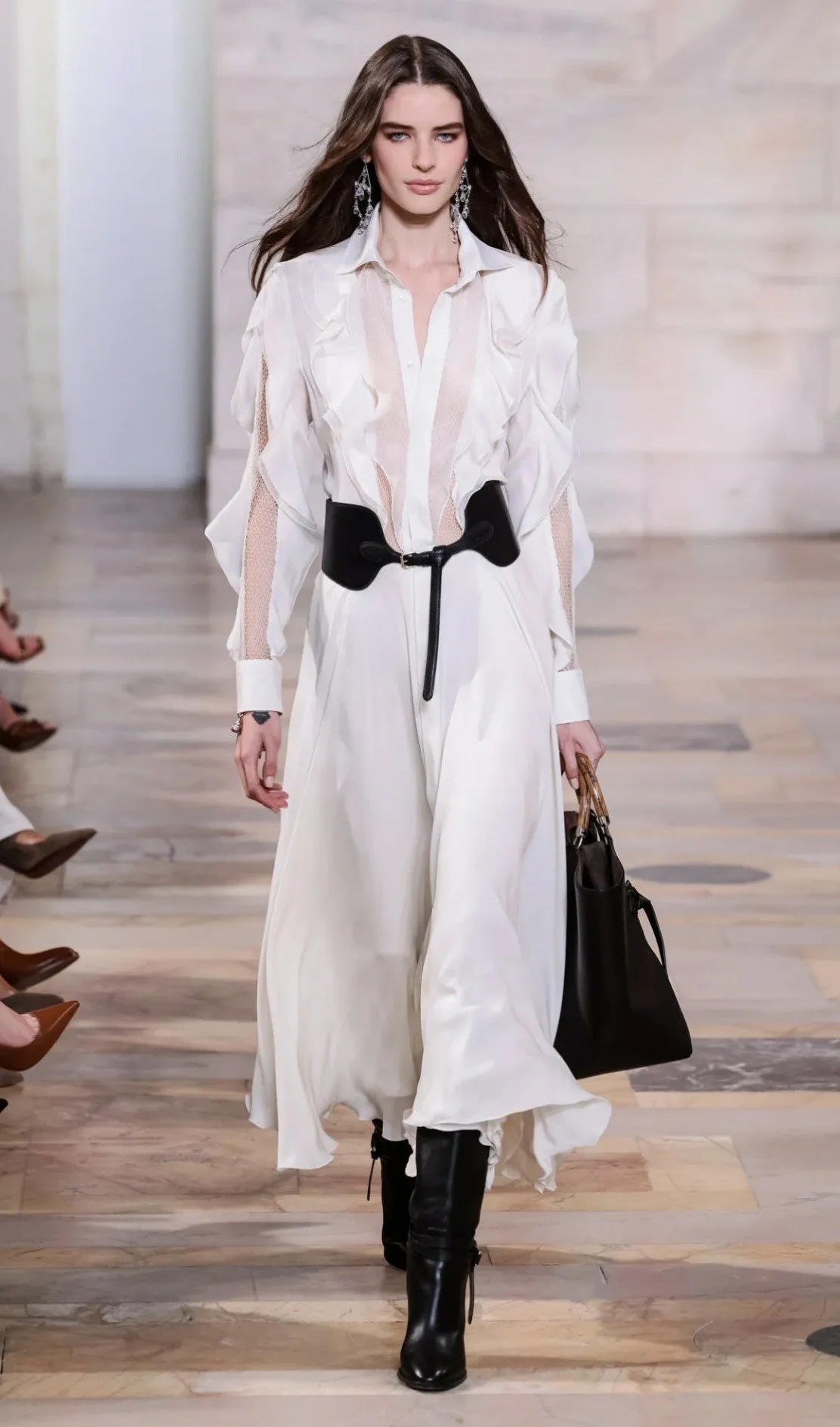 Ralph closes with romance — a flowing white dress with sheer inserts, ruffled details, and tall black boots for contrast. Lightness is anchored with strength.