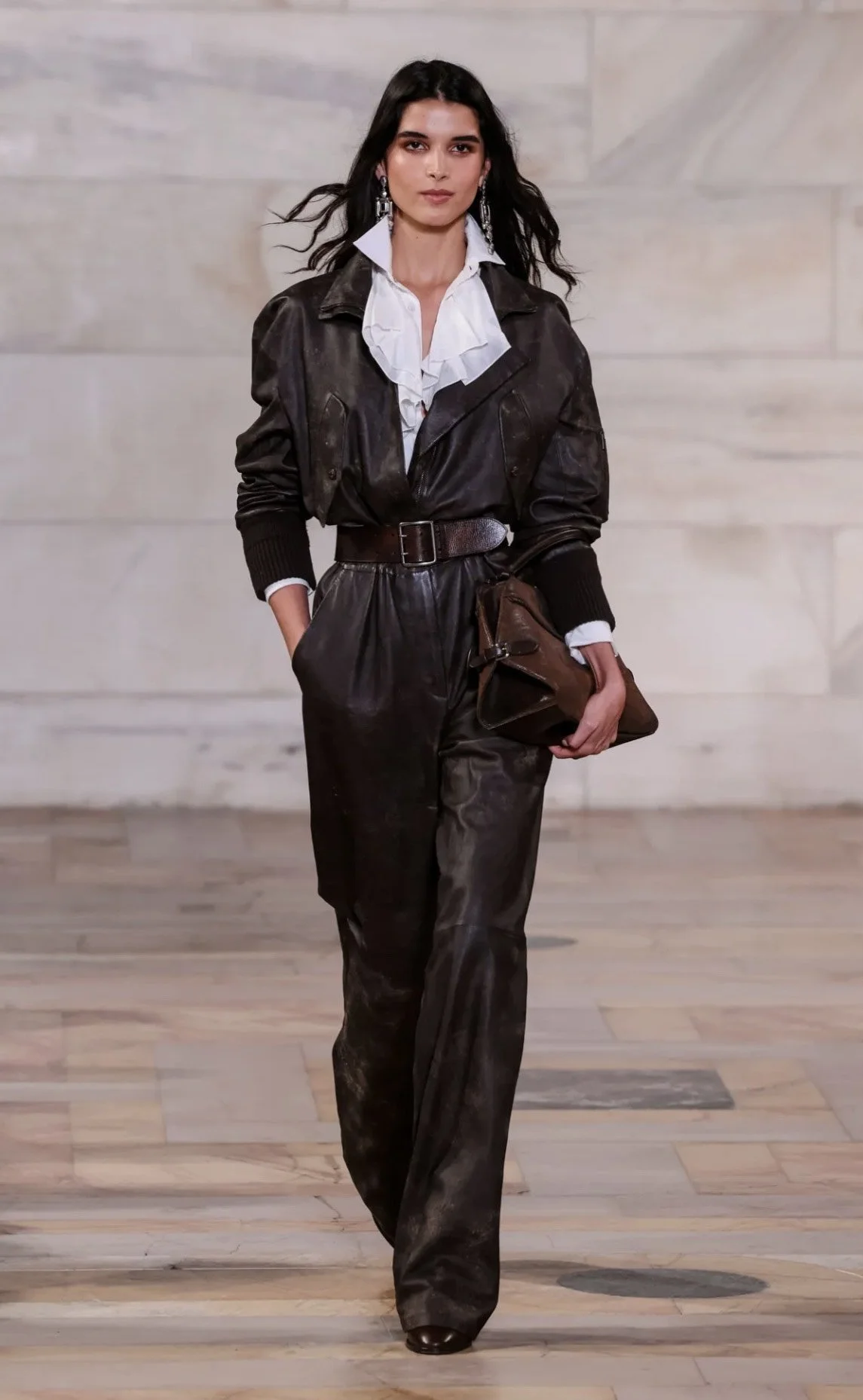 Leather takes center stage in a belted one-piece, styled over a romantic blouse with a ruffled collar. It’s equestrian meets rock-and-roll.