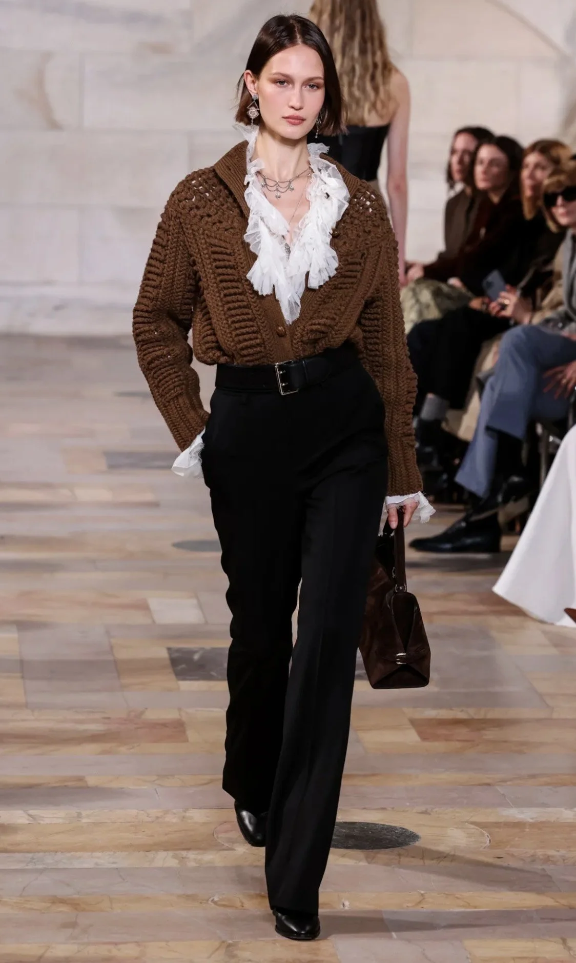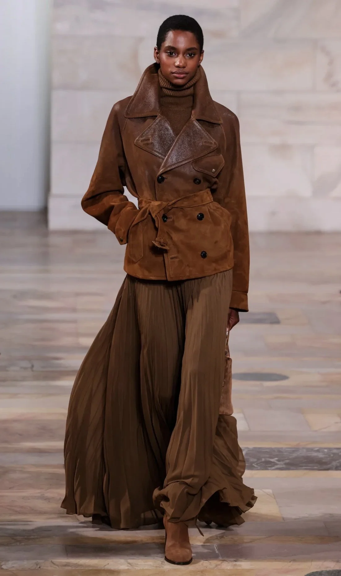 Ralph Lauren’s American heritage speaks through a suede jacket, a chunky turtleneck, and pleated wide trousers in tonal shades of brown. Rich textures create warmth and depth.