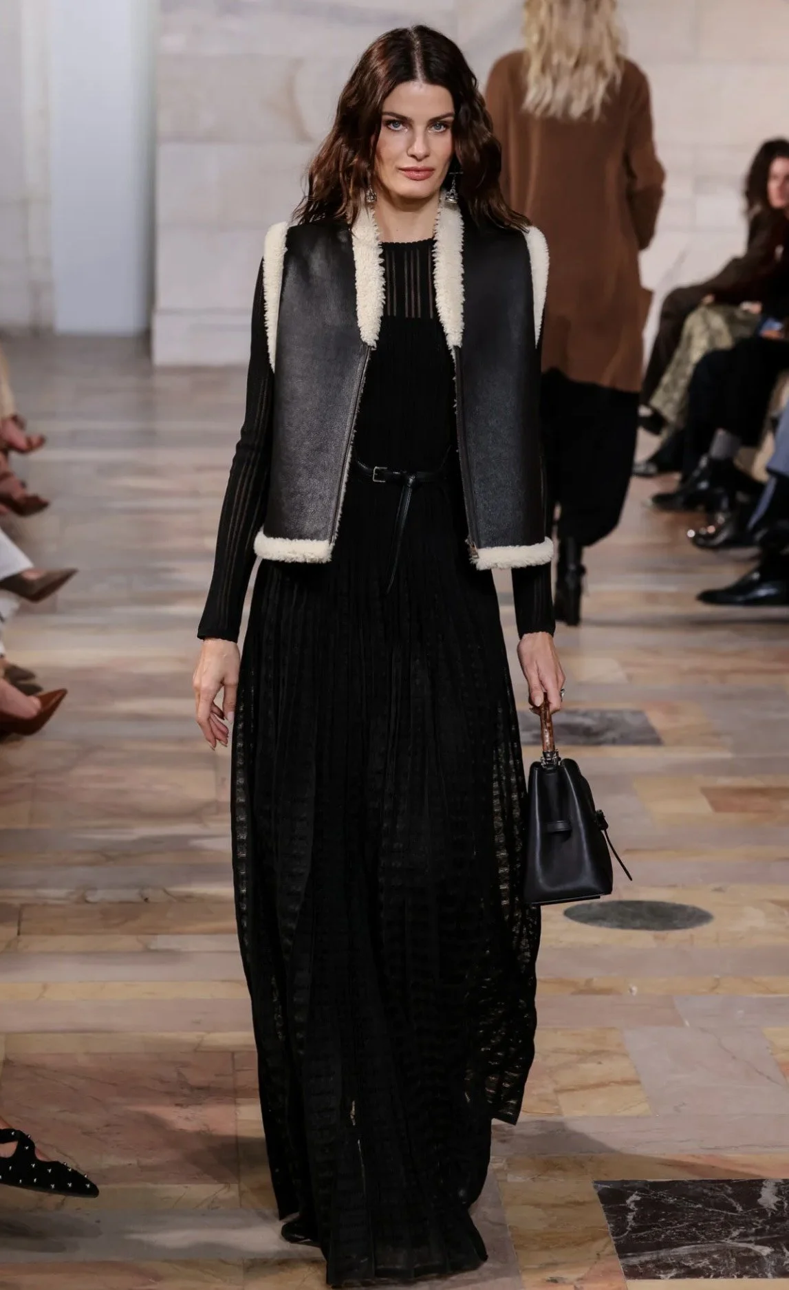 An elegant black maxi dress is topped with a cropped shearling vest, giving drama without overwhelming the silhouette. The look plays with proportion, using layering to break up head-to-toe black.